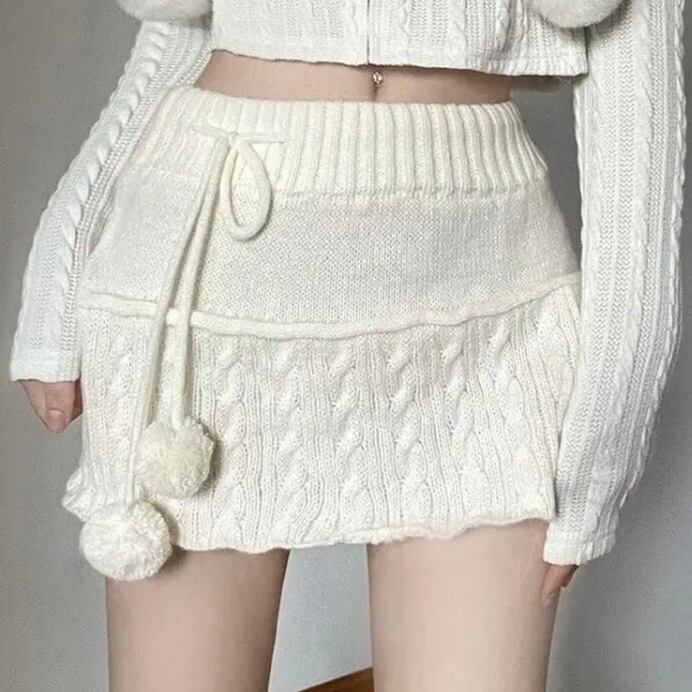 しっかりとしたケーブル編みのニット素材で暖かく、可愛らしいシルエットが魅力のミニスカートです。足元を華やかに演出します。
